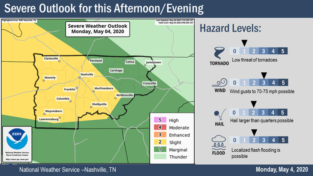 "We will get some rain, but the worst of the storms will go south of Nashville, or south of Interstate 40. The main threats for those southern counties are straight line winds, large hail and isolated flash flooding."
