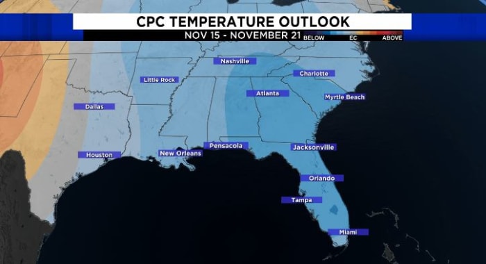 Widespread 40s for overnight temperatures will be possible to start the week of Nov. 14. The first 30s of the season will also be possible in a few spots northwest of Orlando in that timeframe.